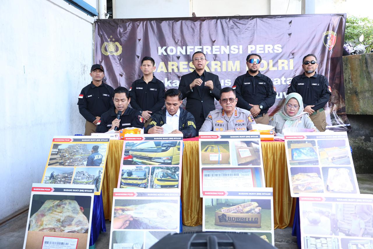 Konferensi pers tersebut dihadiri Kabag Penum Divhumas Polri Kombes Pol Erdi A. Chaniago, Kasubdit I Dittipidter Bareskrim Polri Kombes Pol Setyo K. Heriyatno, Kasat Resmob Bareskrim Polri Kombes Pol Teuku Arsya Khadafi, serta Ketua Kelompok Substansi Pengawasan Keamanan Produk Hewan Kementerian Pertanian Drh. Ira Firgorita.