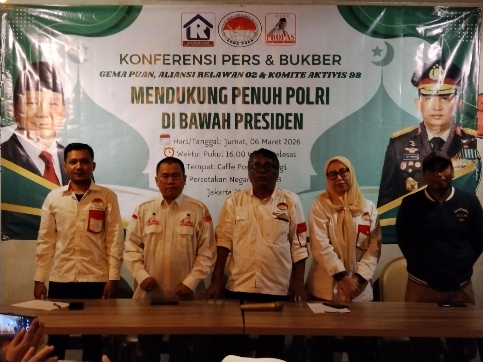Jakarta – Relawan Gema Puan bersama Aliansi Relawan 02 dan Propas menggelar konferensi pers yang dirangkaikan dengan kegiatan buka puasa bersama di Cafe Pondok Rangi, Jakarta Pusat, Jumat (27/3/2026). Kegiatan ini menjadi momentum untuk menyampaikan pernyataan sikap bersama terkait berbagai isu yang berkembang mengenai institusi Kepolisian Republik Indonesia (Polri).