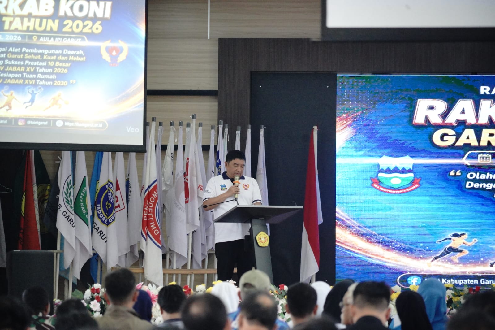 Bupati Garut, Abdusy Syakur Amin, menghadiri sekaligus membuka Rapat Kerja Kabupaten (Rakerkab) KONI Garut Tahun 2026 yang digelar di Aula Institut Pendidikan Indonesia (IPI) Garut, Jalan Terusan Pahlawan, Kecamatan Tarogong Kidul, Kabupaten Garut, Kamis (23/4/2026).