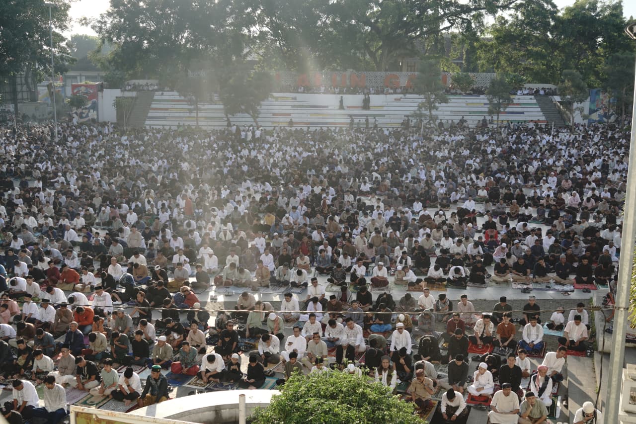 Bupati Garut, Abdusy Syakur Amin, melaksanakan Salat Idulfitri 1447 Hijriah bersama ribuan masyarakat di Masjid Agung Garut, Kecamatan Garut Kota, Sabtu (21/3/2026). Pelaksanaan salat tahun ini dipimpin oleh Ketua DKM Masjid Agung, K.H. Muhammad Sufina sebagai Imam, serta K.H. Cecep Abdul Halim, LC yang bertindak sebagai Khotib.