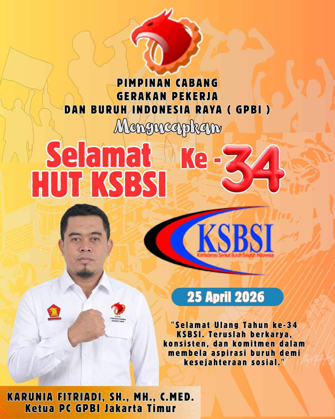 Ketua Pimpinan Cabang Gerakan Pekerja Buruh Indonesia Raya (GPBI) Jakarta Timur, Bung Karunia Fitriadi, SH., MH., C.Med., menyampaikan bahwa eksistensi KSBSI hingga saat ini menunjukkan peran penting organisasi buruh dalam memperjuangkan hak-hak pekerja secara berkelanjutan.