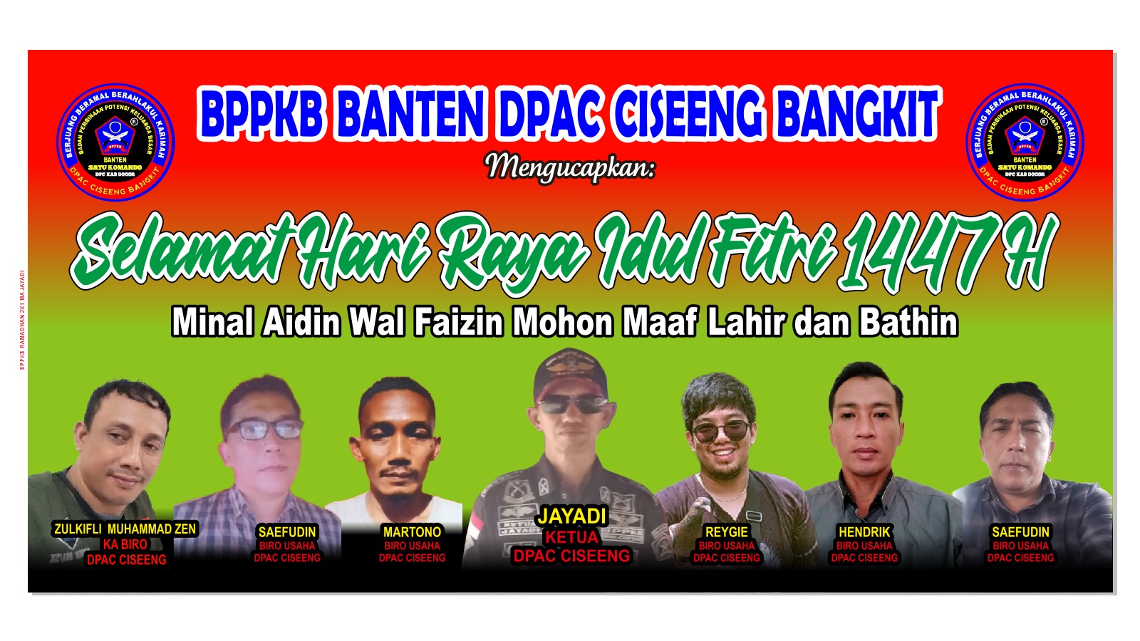 “Atas nama keluarga besar BPPKB Banten DPAC Ciseeng Bangkit, kami mengucapkan Selamat Hari Raya Idul Fitri 1447 Hijriah, Mohon Maaf Lahir dan Batin. Semoga di hari yang fitri ini kita semua diberikan keberkahan, kesehatan, serta semakin mempererat kebersamaan,” ujar Jayadi