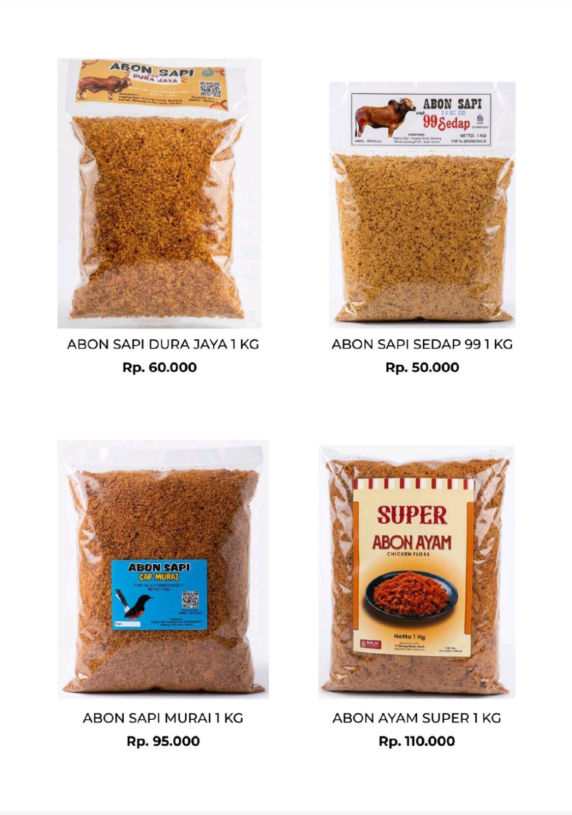 – Produk Olahan: Abon Sapi dan Ayam dengan berbagai varian merek dan harga.