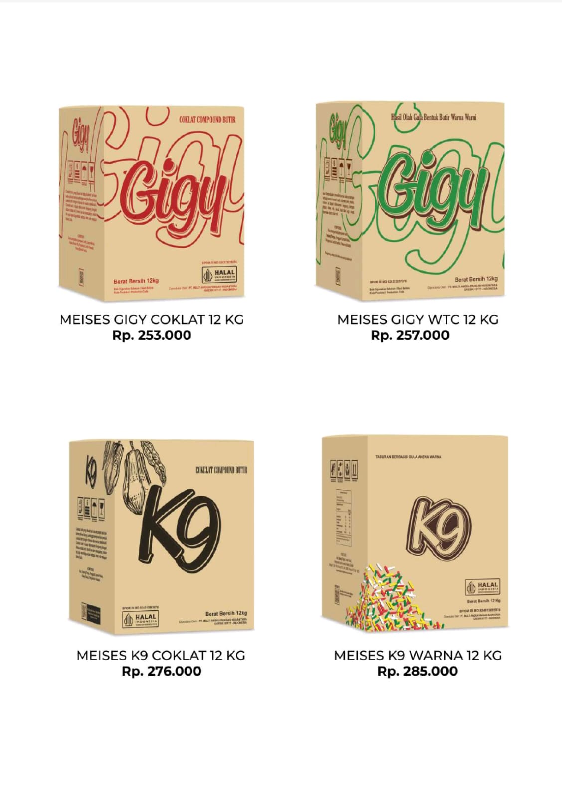 – Bahan Kue & Cokelat: Pasta Delta Eco, Cokelat Compound Virgo, Gula Halus, Whipping Cream, Meises berbagai merek (Jokari, Gigy, K9), Margarin (Menara, Palmvita, Palmboom), dan Tepung Terigu.